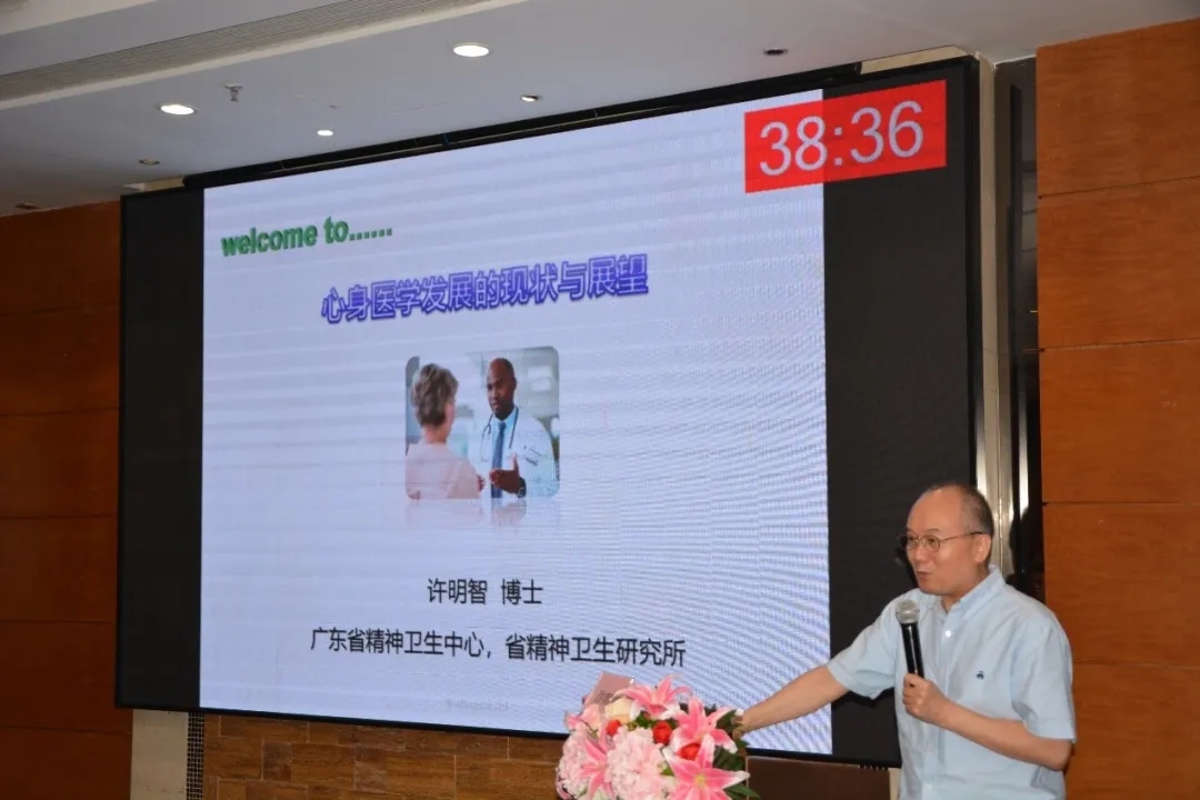 随后,本次会议特邀嘉宾广东省心身医学分会主任委员、广东省人民医院许明智教授致辞,许明智教授表示非常荣幸能来到五邑地区和各位同道、专家进行交流。许明智教授就《心身医学的发展现状和展望》课题展开讲解,心身医学相对其他学科仍未形成成熟的体系,从国际上心身医学发展来看,心身医学的发展是多元化的,已然形成了规范化、学科化的专业领域,能与不同类型的临床学科相结合,建立不同学组的亚专科。心身医学未来的工作重点加强继续教育和培训,不断提高临床医生的整体诊疗水平,以综合模式着力解决心身医学相关疑难病症,减轻心身疾病患者的痛苦,要避免画地为牢,不要局限于自己的门诊和病房,要走出去,把整个医院作为心身医学的阵地,协助其他临床学科处理相关问题不断推行心身医学与其他临床学科相结合的诊疗理念。