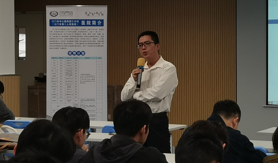 其后,江门市第二人民医院(江门市中心医院蓬江分院)副院长闫志兵对准结业学员宣讲了该院的2025年人才招聘计划。闫志兵首先对蓬江分院的发展历程和近期发展规划做了简单介绍,紧接着详细讲解了蓬江分院2025年的人才需求、员工待遇、食宿安排、政策倾斜等情况,并表示蓬江分院特别期望总院(江门市中心医院)的结业住培医师能加入蓬江分院的大家庭。
