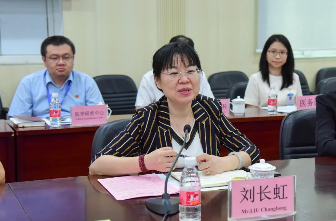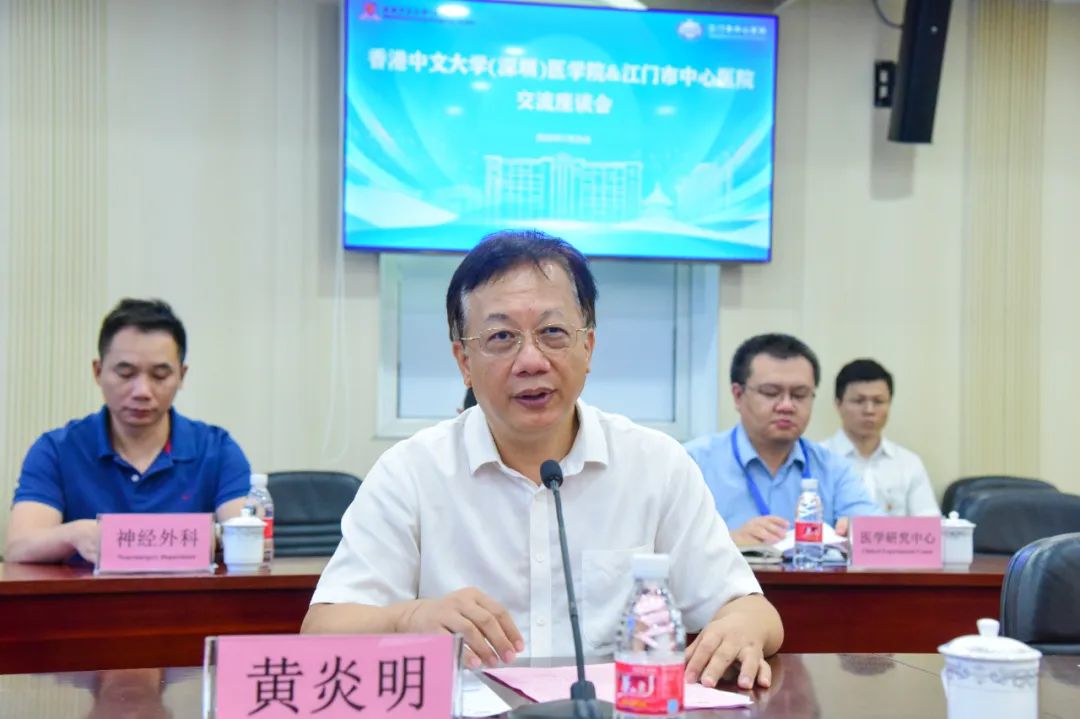 刘长虹介绍了江门市科技政策情况,包括粤江基金、市重大科技项目实施、华南生物医药大动物模型研究院等内容,并表示期待香港中文大学(深圳)医学院与江门市中心医院开展深度合作。