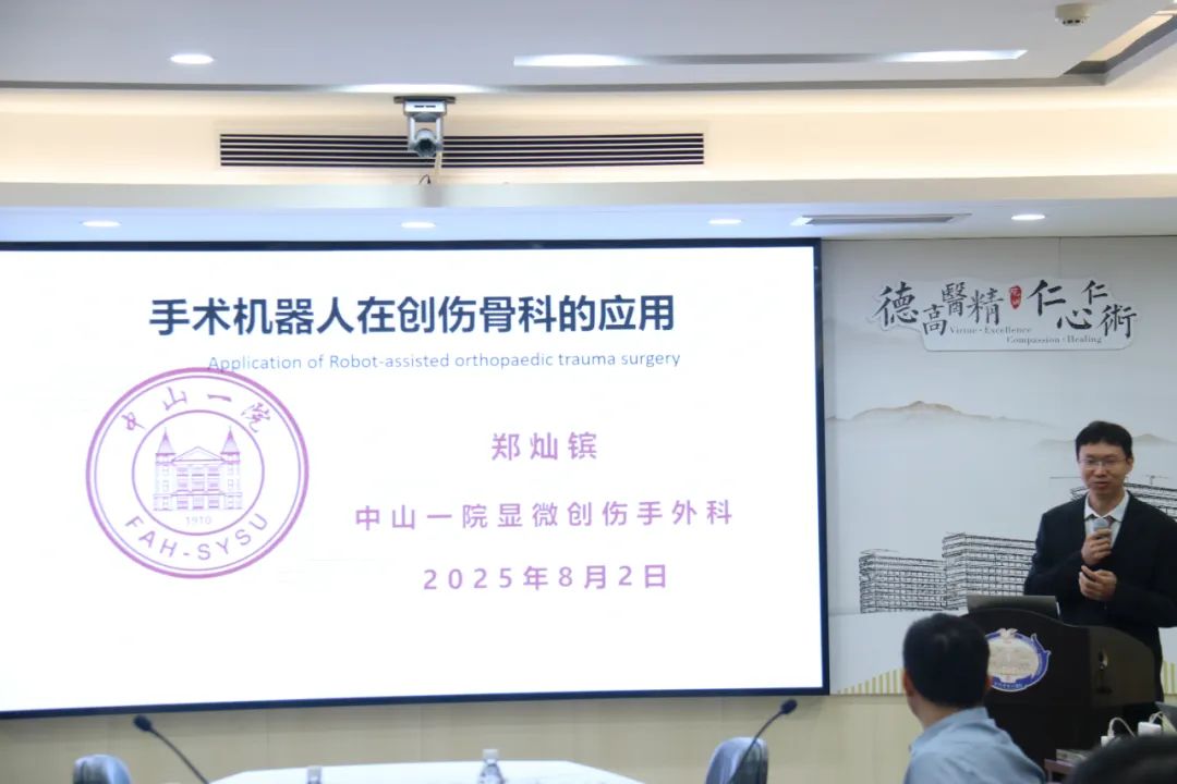 随后,中山一院专家团队围绕“显微创伤手外科前沿进展与临床转化”主题,呈现了内容丰富、观点前沿的学术分享:朱庆棠副院长以《严重肢体创伤救治——中山一院的理念与实践》为题,分享了中山一院在断肢再植和严重肢体创伤救治领域的历史沉淀与创新理念;显微创伤手外科副主任郑灿镔教授以《手术机器人在创伤骨科和显微外科手术中的应用》为题,通过典型病例分析,详细介绍了如何应用手术机器人破解临床精准定位及微血管精细吻合难题;秦本刚教授分享《臂丛神经损伤的诊断和治疗》,对临床实践中臂丛神经损伤的诊疗提出了独到的诊疗思路与见解;戴巧艳护士长就《新质生产力推动护理高效协作模式的实践》进行经验交流,带给我们以创新为驱动、高效团队赋能的启发。