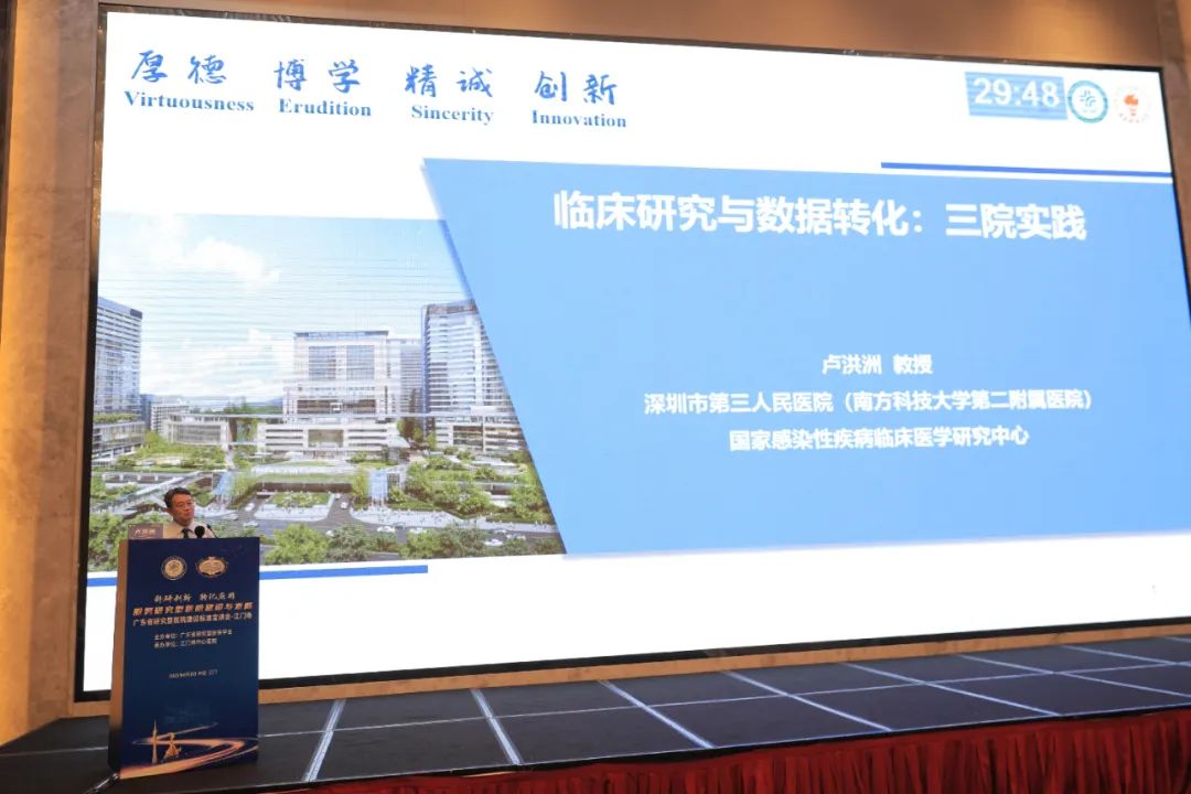第二部分由中山大学附属第五医院常务副院长姚麟主持,深圳市第三人民医院院长卢洪洲作《临床研究与数据转化:三院实践》主题汇报,结合自身医院的发展历程,详细介绍医院以科研创新为驱动,通过整合院内医疗资源,构建多学科协作团队,积累海量临床数据,积极搭建临床研究与数据转化桥梁的成功经验。