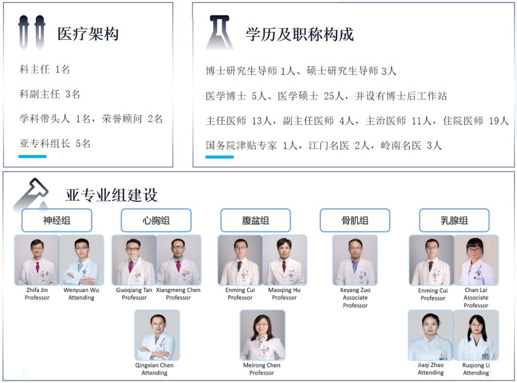 科室设有神经、心胸、腹部、骨肌和乳腺5个亚专业组,拥有包括胸腹部及乳腺影像组学、医学大数据、医学人工智能和图像处理等多个优秀科研团队,组建了江门市医学影像研究所、人工智能与大数据科研平台以及区域放射医学影像诊断中心,推动了五邑地区医学影像临床、科研和教学事业的蓬勃发展。