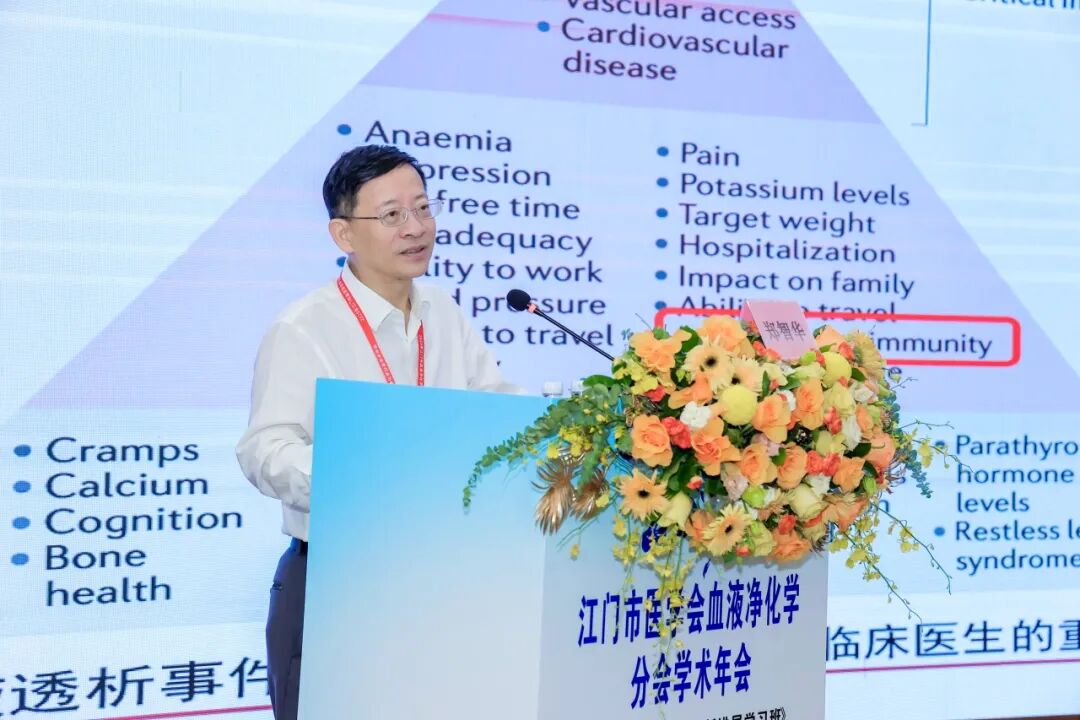徐庆东主委则聚焦当下,详细介绍了血液净化核心指标的管理,为医疗质量的同质化提升指明方向。广州市第一人民医院秦曙光教授、江门市中心医院马惠娟医师、中山大学附属第六医院苏宁教授随后对高磷血症管理共识、IHOPE研究及CAR-T在肾脏疾病中的运用前景进行了精彩剖析。