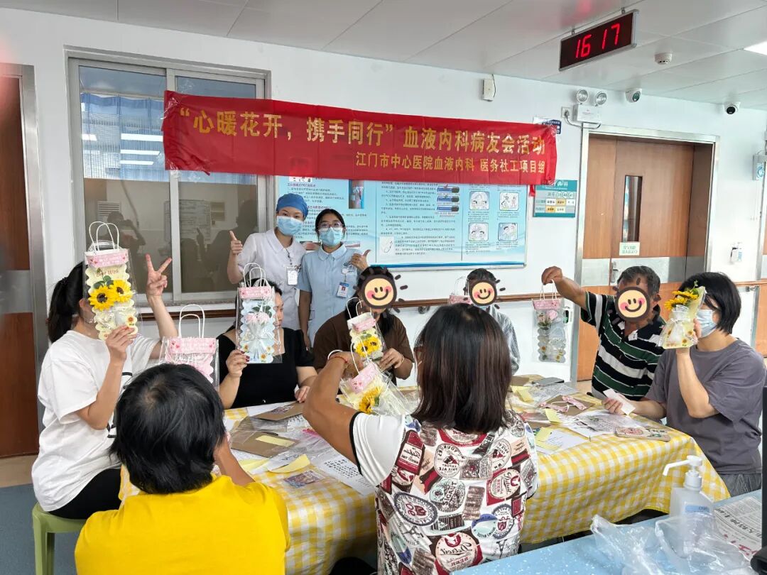 为缓解血液内科病友不良情绪,助其了解、接纳情绪,提升治疗生活质量,9月23日,医务社工项目组携手血液内科开展“心暖花开,携手同行”病友会活动。医务社工以花为载体,让患者读懂情绪。病友制作花卡片时与心灵对话,释放烦躁与不安。