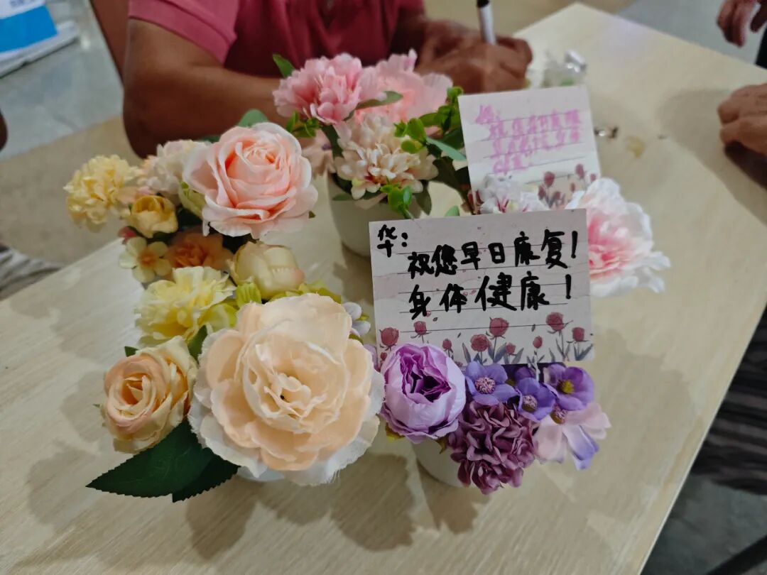 工作坊以“同路人·共守望·传递爱”为核心理念,组织患者、家属与志愿者参与手工制作活动,搭建互助支持平台,让患者获得情感支持,建立积极心态,营造温暖有爱的住院环境。9月29日,“玫瑰工坊”首次活动在妇科二区住院部开启,病友和家属在医务社工鼓励下手作盆栽、写温暖话语,向其他病友传递祝福。手工的温度、书写的真挚、传递的温情,不仅抚慰了病中的心灵,也唤醒了人与人之间最朴素的情感联结。