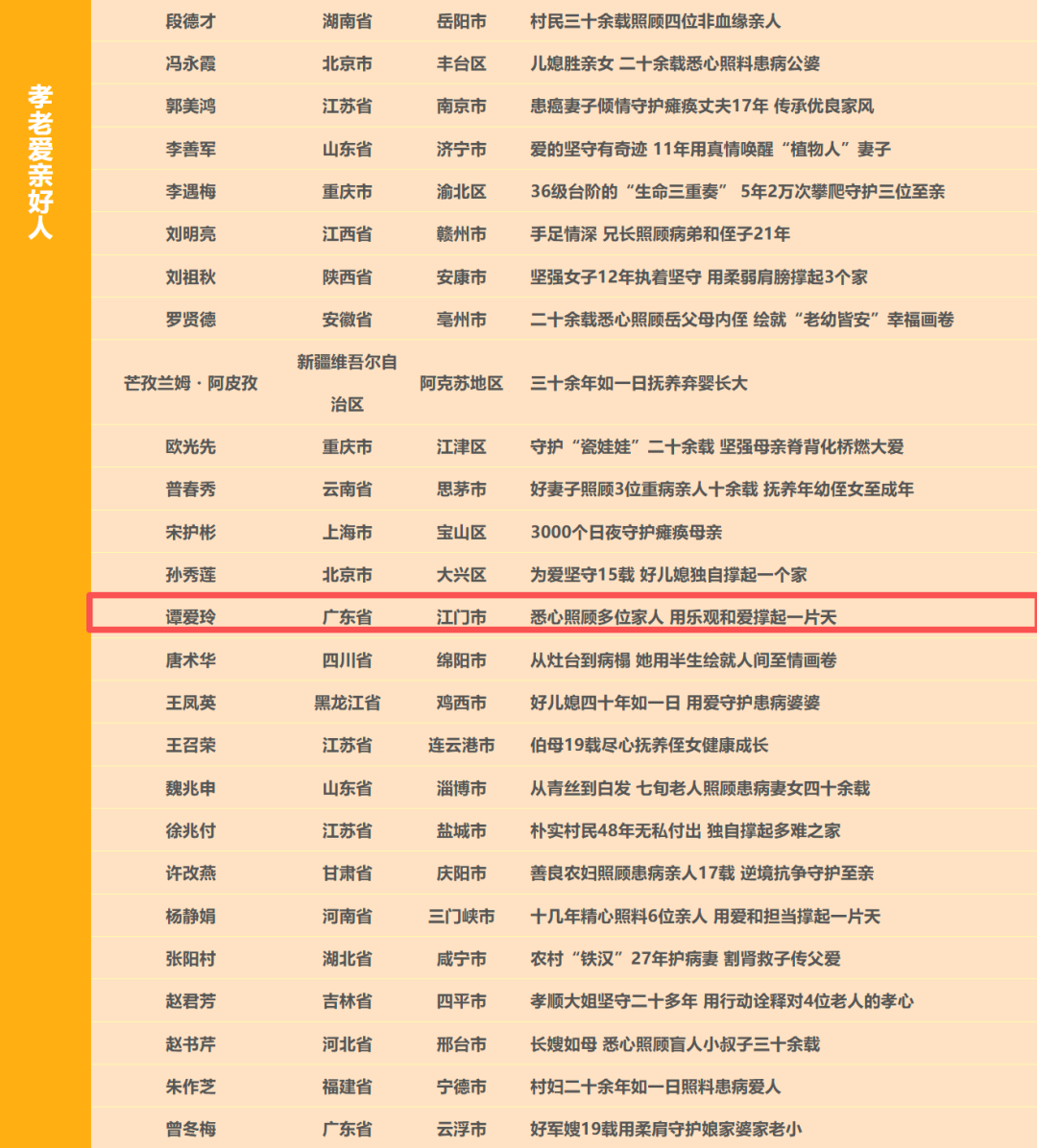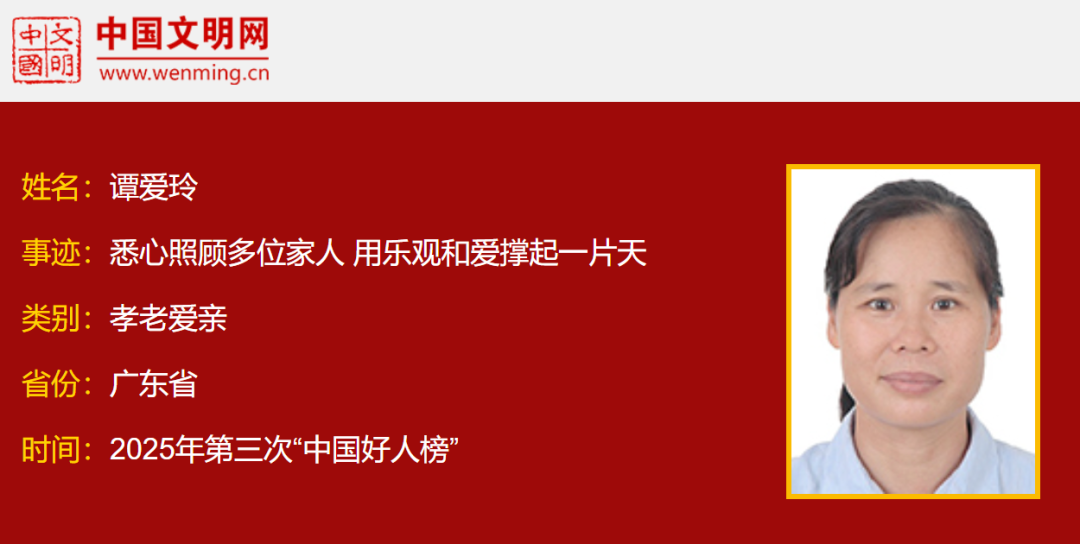 除了侍奉高堂、照顾妹妹和外甥,谭爱玲还是一名热心公益的志愿者,总是力所能及地帮助他人,抽出时间参加各类志愿活动,累计服务时长超8000小时。谭爱玲用半生的奉献与坚守,谱写了孝老爱亲的感人篇章。