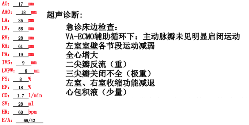 行呼吸机、ECMO等治疗后,小莫的血压、血氧饱和度等虽然暂时稳定住了,但“室速”这颗“炸弹”不拆除,仍无法脱离危险,而且心脏彩超结果提示,小莫的心脏已经出现严重衰竭:射血分数严重降低(EF 18%),全心扩大,多瓣膜重度反流。抽血等结果也提示小莫的病情仍在加重:出现贫血、低血小板、凝血功能紊乱、酸中毒、感染指标升高等。