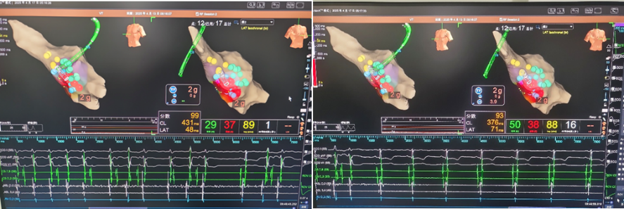 在心血管内科、PICU的协调配合下,小莫在ECMO循环辅助下送入导管室。高伟栋主任率领电生理团队迅速为患者进行心腔内电生理检查及标测——经过1个小时的详细检查及仔细标测,精准定位到位于左心室的“室速病灶”。于“病灶”处射频消融数秒钟,顽固的“室速”就终止了,经巩固消融后,重复刺激再未诱发心动过速。手术取得圆满成功,术后小莫的心律、血压及氧合指标逐步趋于稳定。