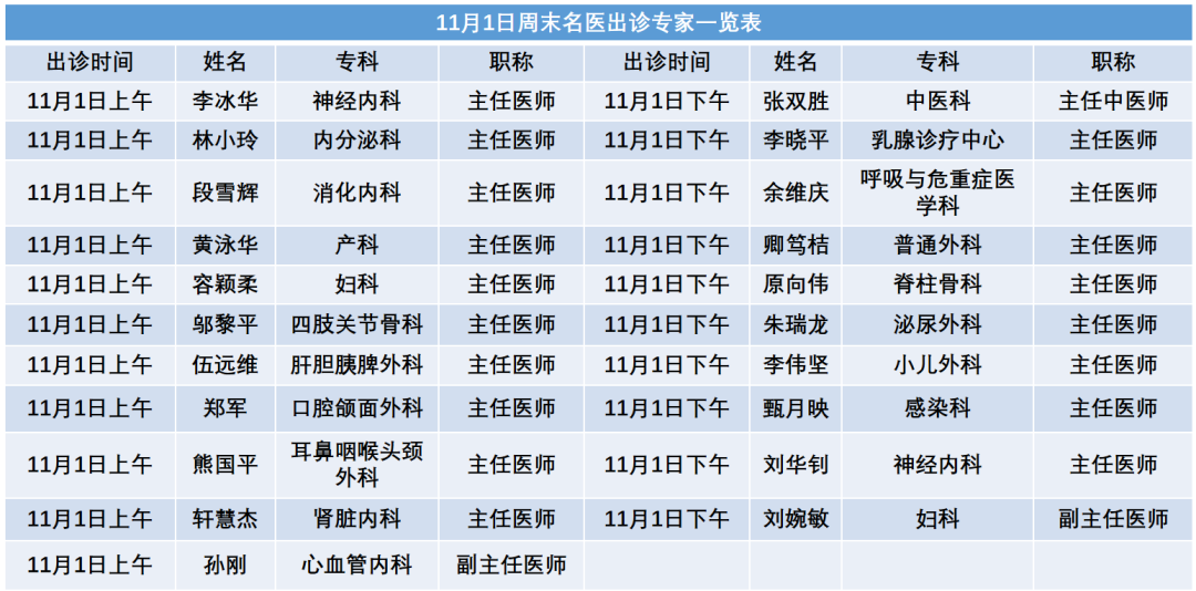 每周六名医门诊号源逢周一下午6点前对外放号,实行全预约及限号管理,有就诊需求的市民敬请提前预约挂号!本期具体出诊安排及专家如下: