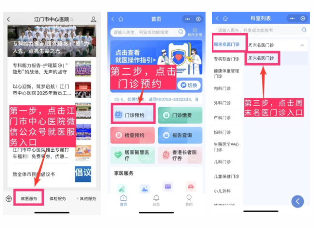 挂号路径为:微信公众号——就医服务——门诊预约——周末名医门诊。