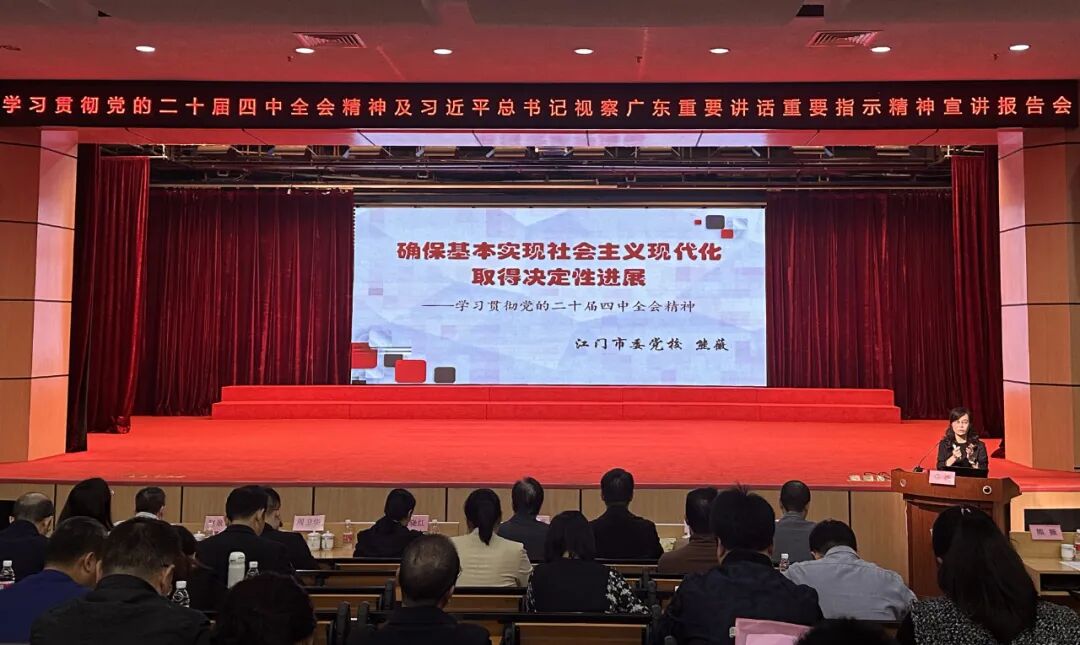 宣讲会上,熊薇同志以《确保基本实现社会主义现代化取得决定性进展——学习贯彻党的二十届四中全会精神》为题,结合学习贯彻习近平总书记视察广东重要讲话重要指示精神,紧扣江门的区位优势、产业发展实际等系统阐述了党的二十届四中全会的重大意义,深刻阐明了“十五五”时期的历史方位,详细解读了“十五五”时期社会发展的总体部署和重大任务。她表示要切实把这些战略任务的决策意图、目标要求、重大举措、工作重点贯彻落实好。