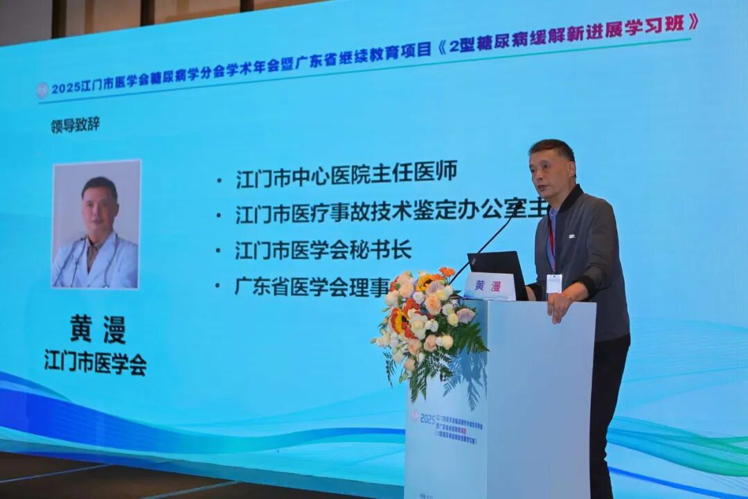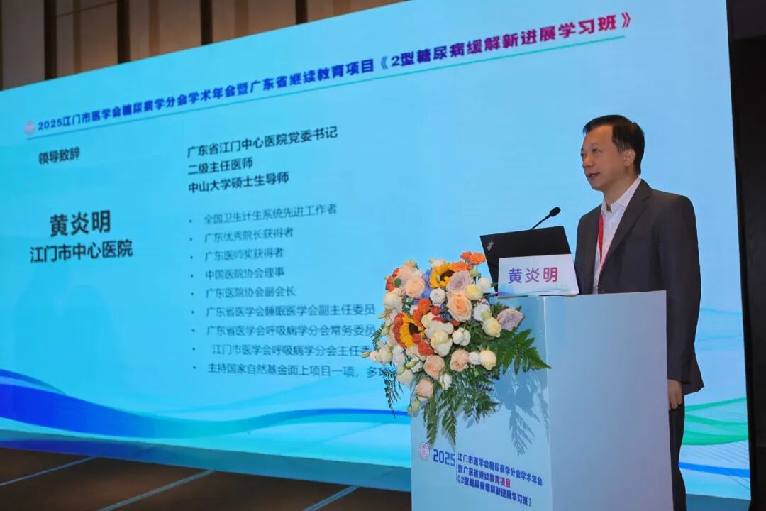 江门市医学会糖尿病学分会主任委员、江门市中心医院主任医师温志刚致开场辞。他指出,近年来糖尿病发病率持续攀升,已成为威胁公众健康的重大慢性疾病,提升基层医疗机构诊疗能力、加强学术交流与协作是应对这一挑战的关键。江门市中心医院党委书记黄炎明对本次年会的召开表示祝贺。他表示,本次会议既是展示省内糖尿病与内分泌领域最新研究成果的窗口,也是推动江门地区医疗资源整合、促进分级诊疗落地的重要契机。