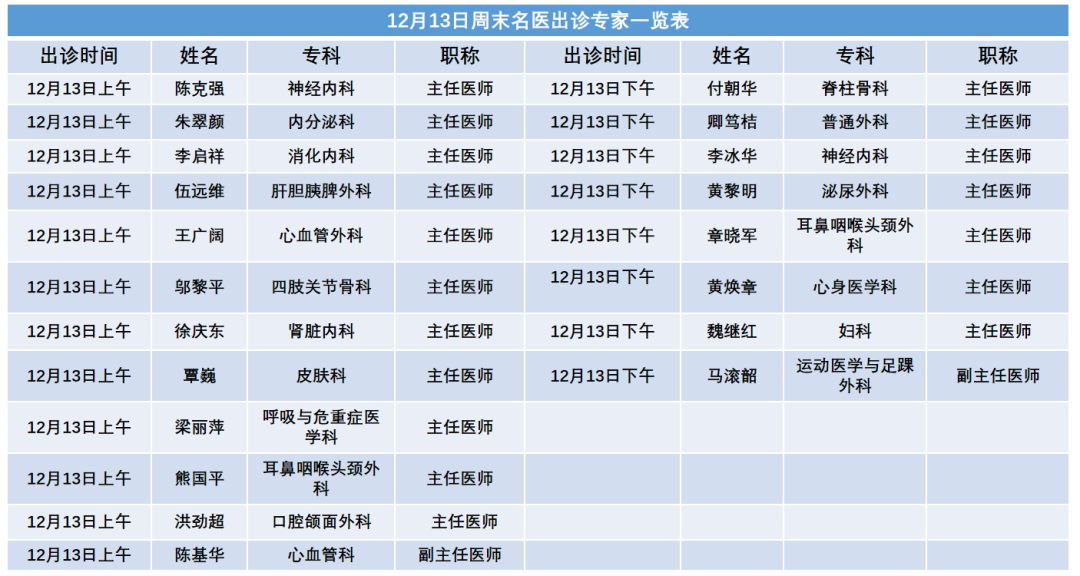 每周六名医门诊号源逢周一下午6点前对外放号,实行全预约及限号管理,有就诊需求的市民敬请提前预约挂号!本期具体出诊安排及专家如下: