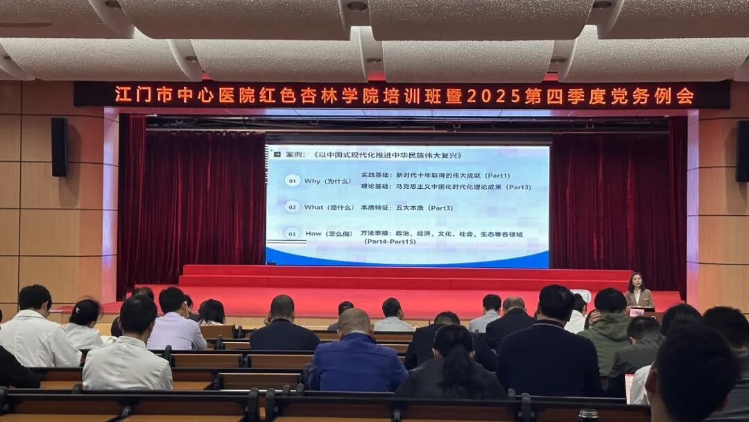 为持续加强江门市中心医院宣讲员队伍的建设,提高宣讲员宣讲水平,擦亮队伍品牌,12月23日下午,我院党委组织举办红色杏林学院培训班(第十四期)暨党务例会,邀请五邑大学马克思主义学院专任教师、我院院外宣讲员刘露晓作专题辅导讲座,党委书记黄炎明、党委副书记张品及全体党支部书记、支委、支部联络员、学习宣讲员约200人参加培训。