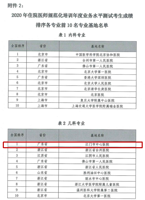 本基地自2015年开始招收学员,至今共培训学员62名。其中在2020年国家住培年度水平测试中,江门市中心医院儿科专业基地在全国儿科基地中排名第一。部分学员多次参与院内外竞赛均获得优异成绩;社会学员结业就业率为100%,部分学员被我院聘任,其他学员都在二级甲等以上医院工作,均受到用人单位的一致好评。