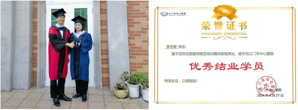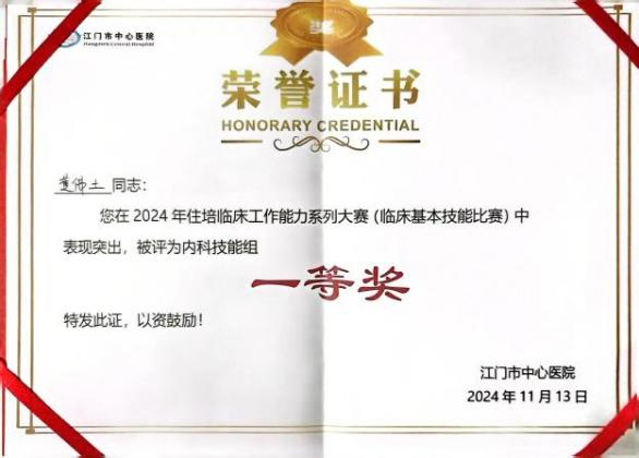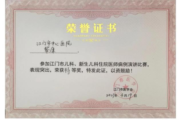 毕业时获得医院优秀结业学员称号;参加2022年江门市第一届儿科住院医师病例演讲比赛荣获一等奖。