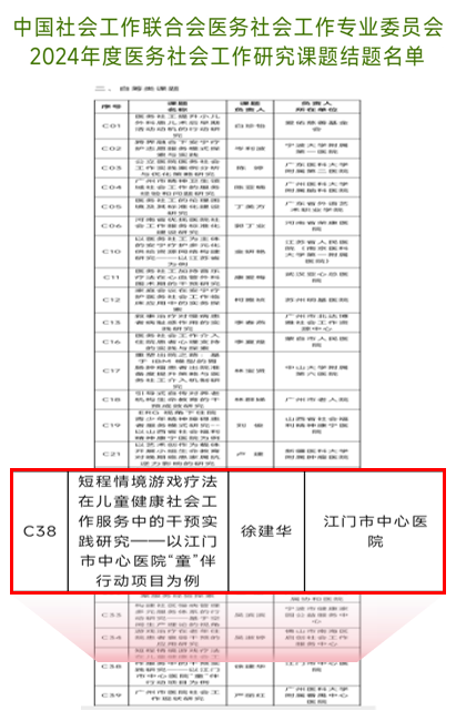 此外,《短程情境游戏疗法在儿童健康社会工作服务中的干预实践研究——以江门市中心医院“童”伴行动项目为例》入选中国社会工作联合会医务社会工作专业委员会2024年度医务社会工作研究课题优秀课题,团委书记徐建华还受邀到北京进行成果分享。