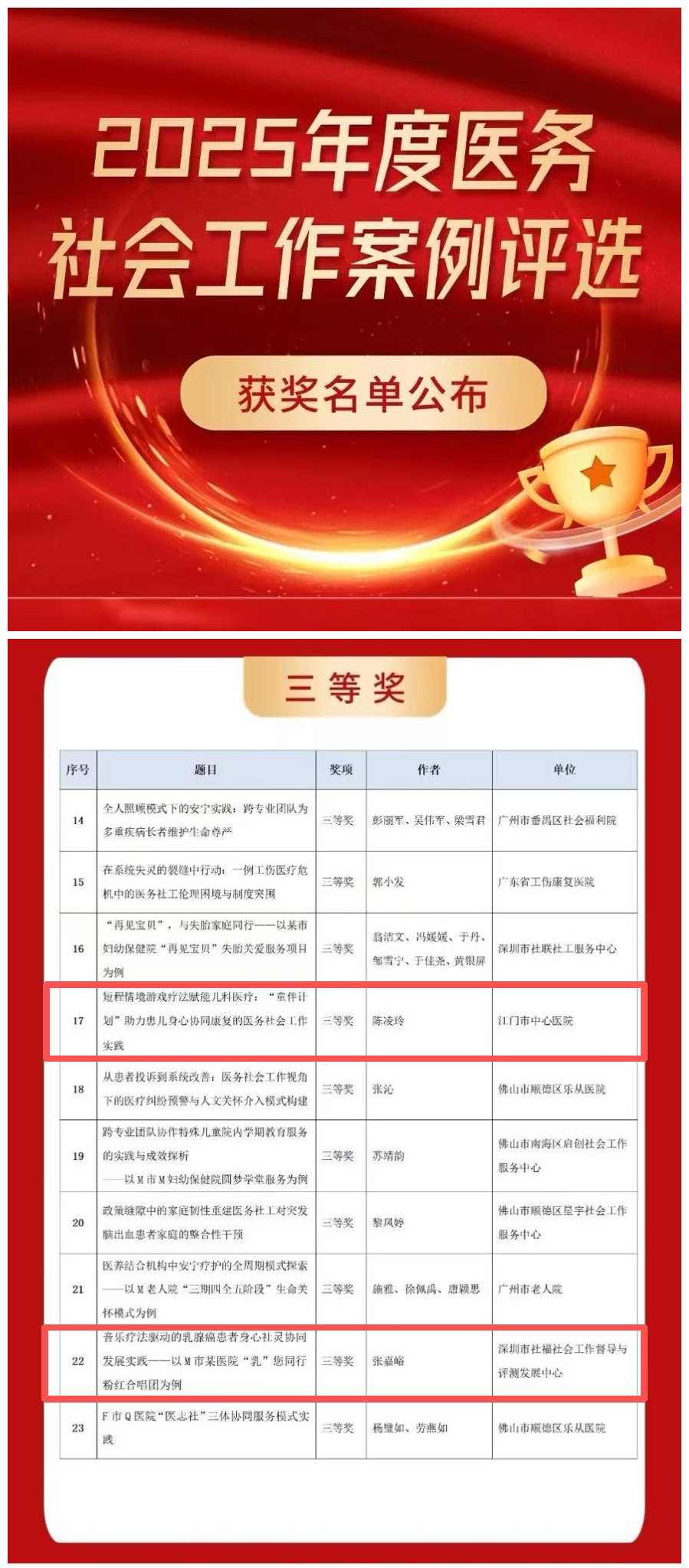 《短程情境游戏疗法赋能儿科医疗:“童伴计划”助力患儿身心协同康复的医务社会工作实践》和《音乐疗法驱动的乳腺癌患者身心社灵协同发展实践——以M市某医院“乳”您同行粉红合唱团为例》两篇案例在2025年度广东省医务社会工作案例征集评选活动中斩获三等奖,在118篇投稿案例中分别获得第17名和22名,获得省级层面的认可。