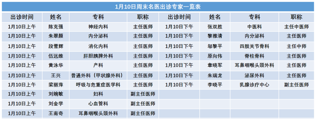 每周六名医门诊号源逢周一下午6点前对外放号,实行全预约及限号管理,有就诊需求的市民敬请提前预约挂号!本期具体出诊安排及专家擅长如下: