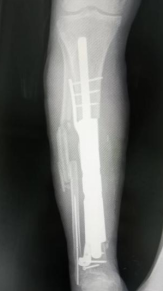 对于此疑难复杂病例,经中山一院专家团队会诊及与病人沟通,并在中山一院周翔教授的指导下,进行了第三次“骨折外固定换内固定、胫骨缺损骨水泥填充、超薄股前外侧游离皮瓣修复创面”的保肢治疗手术。此次手术复杂,历经9小时,最终取得了成功,为保肢治疗奠定了最坚实的基础。后又进行了一次简单的植皮术,病人伤口愈合,第一次住院顺利出院。但此时,患者仍存在胫骨约16cm大段缺损需二次手术修复重建的问题,之前植入的骨水泥只是临时的填充,难以完全承重。传统的方法是进行植骨或骨搬运术,但无论从手术创伤还是骨愈合能力等来说,对于一个72岁的老人均是难以承受的。