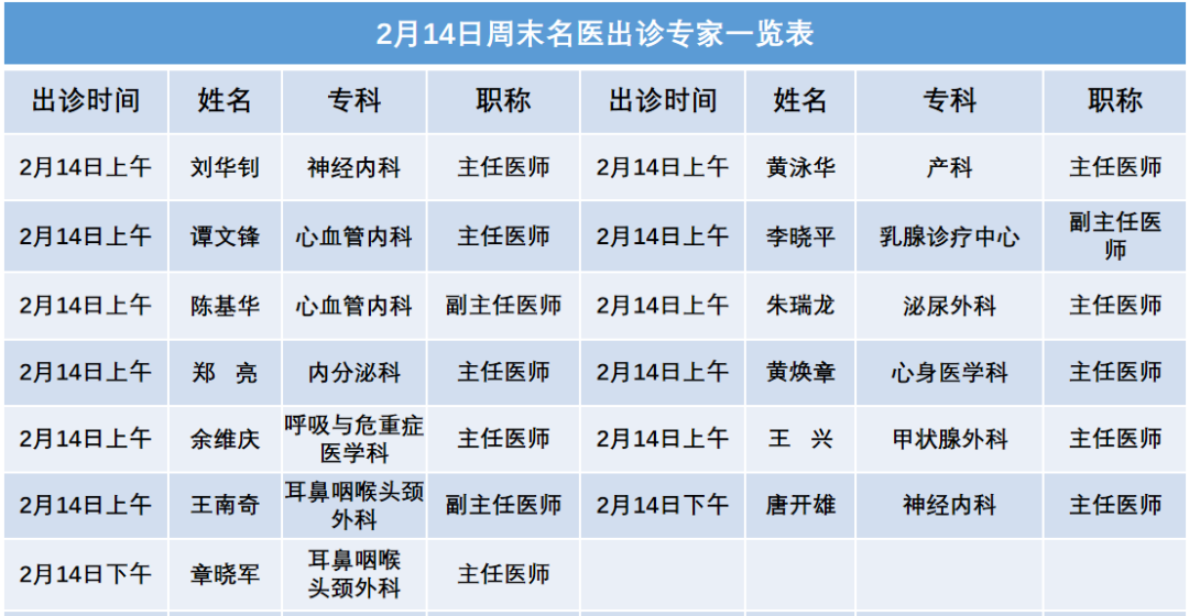 每周六名医门诊实行全预约及限号管理,有就诊需求的市民敬请提前预约挂号!本期具体出诊专科及专家安排: