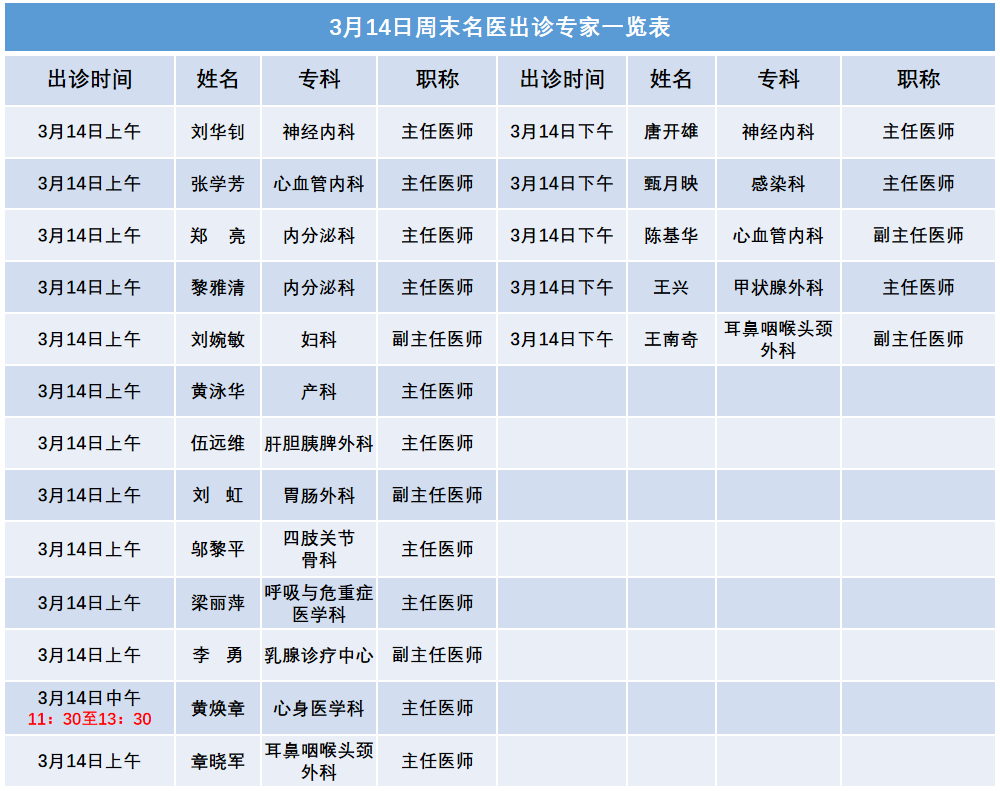 每周六名医门诊实行全预约及限号管理,有就诊需求的市民敬请提前预约挂号!本期具体出诊专科及专家安排: