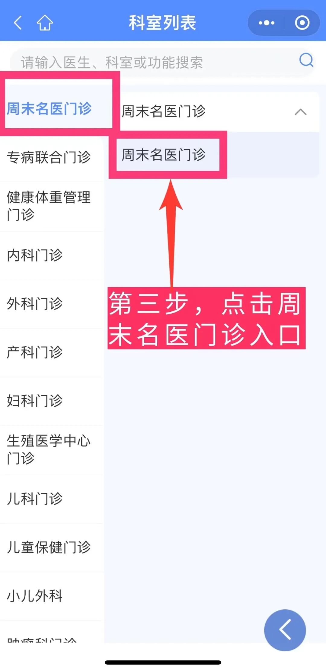 挂号路径为:微信公众号——就医服务——门诊预约——周末名医门诊。