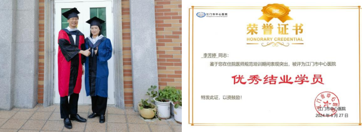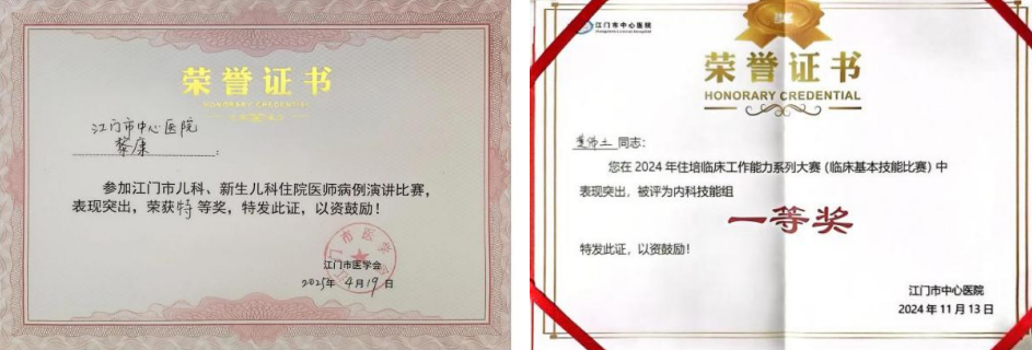毕业时获得医院优秀结业学员称号,参加2022年江门市第一届儿科住院医师病例演讲比赛荣获一等奖。