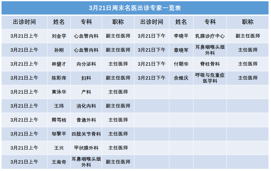 每周六名医门诊实行全预约及限号管理,有就诊需求的市民敬请提前预约挂号!本期具体出诊专科及专家安排: