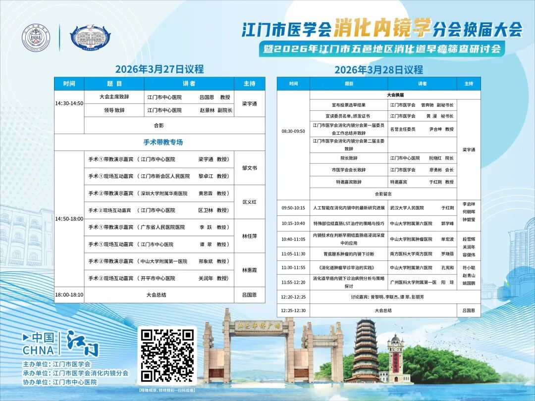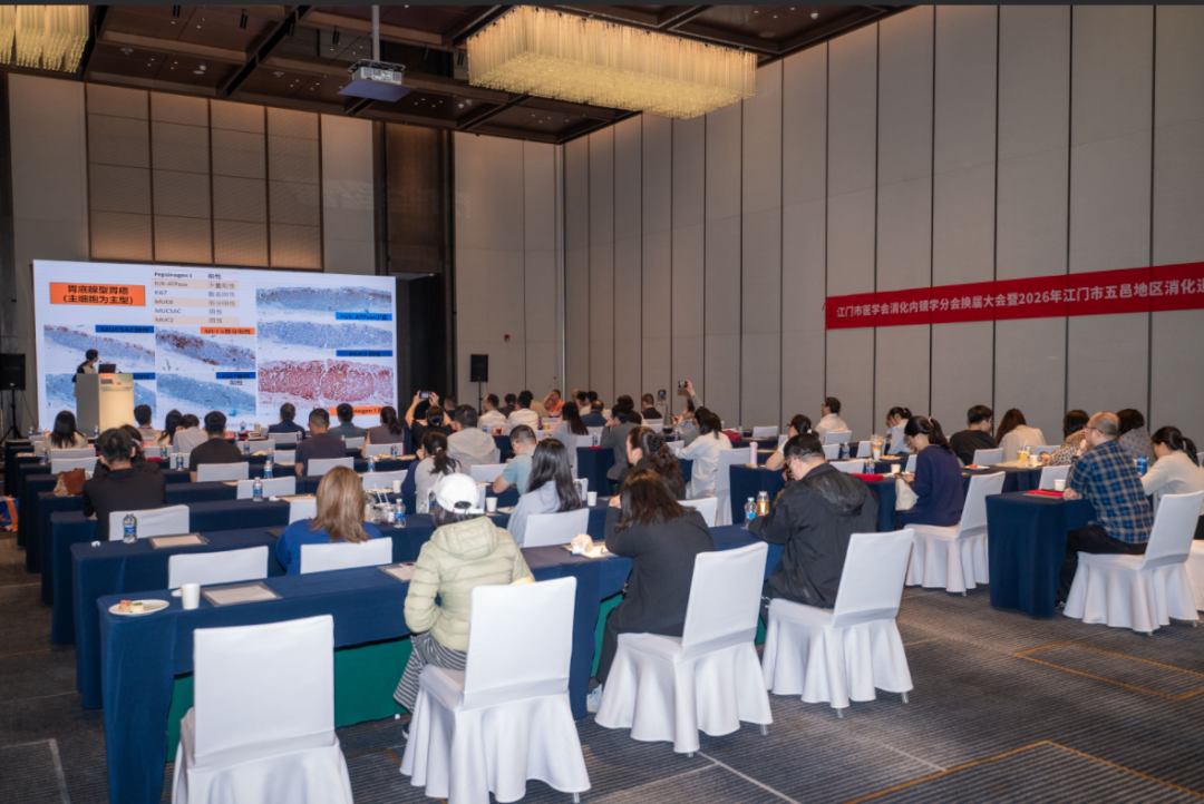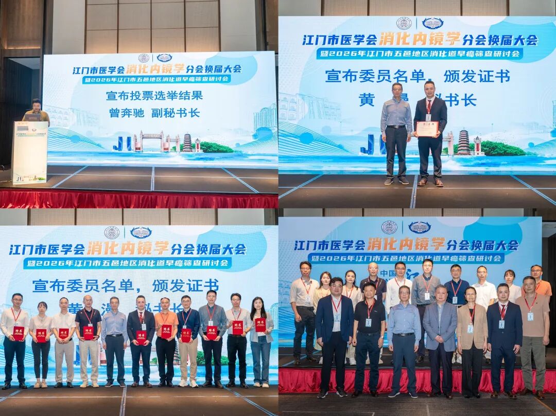 3月27—28日,江门市医学会消化内镜学分会换届大会暨2026年五邑地区消化道早癌筛查研讨会在江门市中心医院举行。本次大会由江门市医学会主办、江门市医学会消化内镜学分会承办。大会汇聚了消化内镜学界近百名专家学者,共设1个主论坛,2个手术演播厅,1个手把手教学现场,通过6场主题报告,4台手术直播演示以及离体猪胃手把手教学等多元形式,为同道呈现了一场具有实用性、前沿性的学术盛宴。