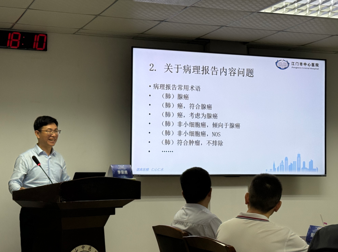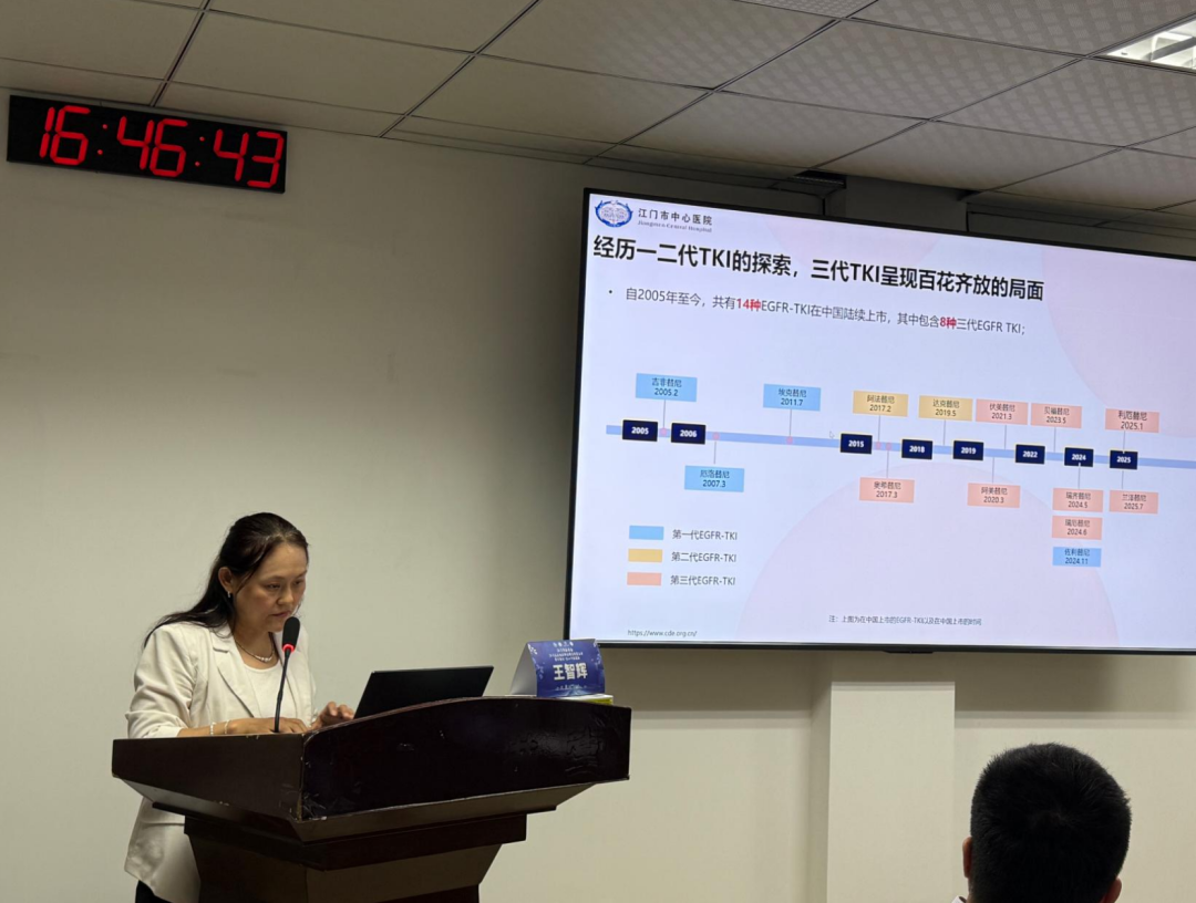 在讨论环节,江门市中心医院肿瘤中心肺部肿瘤病区主任医师刘冬英及主治医师利锦燕、台山市中医院肿瘤综合科主治中医师甄运富及主治医师陈美禄、普外科副主任医师姚树雄、呼吸与危重症医学科主治中医师王超育等专家,围绕病理与临床的有效沟通、一线TGFR-TKI耐药后的个体化选择、脑转移的局部放疗技术选择及干预时机等问题进行了深入交流。
