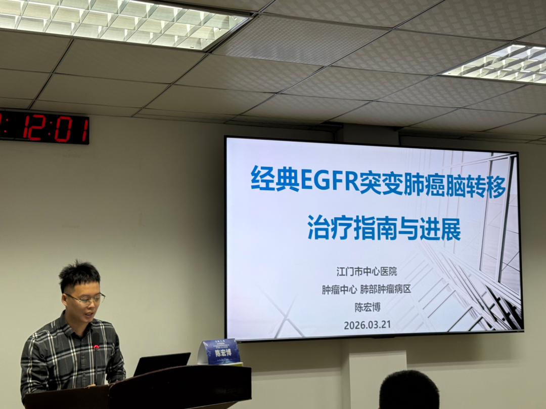 学术环节由肖林担任主持。江门市中心医院病理科主任李荣岗以《临床医生如何与病理科沟通》为题,围绕肺癌精准检测的规范化应用、病理报告的关键信息解读以及临床与病理科室之间的高效沟通与协作等核心内容进行了系统讲解,强调了精准病理诊断在肺癌个体化治疗中的基石作用。江门市中心医院肿瘤中心肺部肿瘤病区主任医师王智辉分享了《经典EGFR突变NSCLC一线TKI耐药后治疗规范与进展》专题。她指出,三代TKI已成为一线首选,但耐药不可避免且机制多样;耐药后的联合治疗(免疫、抗血管、双抗、ADC等)为临床提供了多种选择。江门市中心医院肿瘤中心肺部肿瘤病区主治医师陈宏博给大家分享了《经典EGFR突变NSCLC脑转移治疗指南与进展》专题,系统讲述了三代EGFR-TKI在肺癌脑转移中的疗效对比及优化治疗模式,重点探讨了立体定向放射治疗在三代EGFR-TKI治疗时代下的价值与介入时机,分析了靶向治疗与局部放疗的优化组合策略。