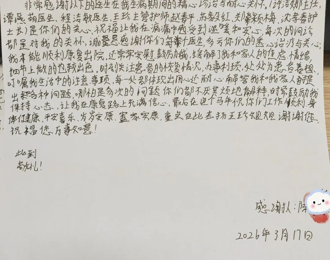 在我们的呵护下,阿俊的肝功能指标慢慢回落,脸色也渐渐有了血色,开始能笑着和我分享校园里的糗事,还会主动跟我讨论术后的饮食计划。看着他从蜡黄憔悴的模样,变回眼神明亮、意气风发的少年,我心里满是欣慰。那封手写的信里,字字句句满是真诚,不仅是对阿俊康复的喜悦,更是对我们整个消化团队专业与耐心的肯定。