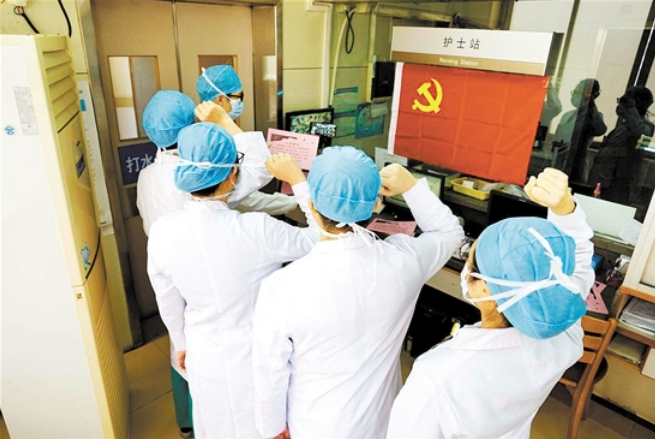 △成立隔离病区临时党支部后重温入党誓词。毛炯 摄