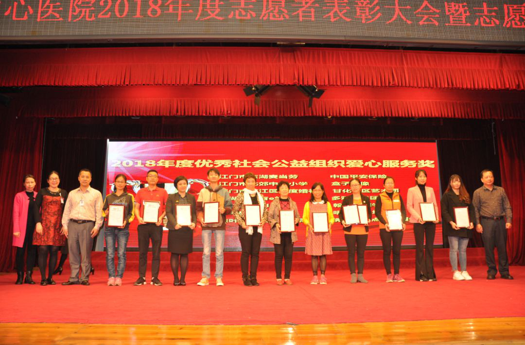 随后,江门市中心医院对2018年度131名院内优秀志愿者、10名优秀无偿献血志愿者、12名社会优秀志愿者、以及19个爱心社会公益组织、5个长期服务爱心公益组织单位进行了表彰。