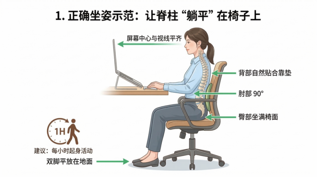 1. 正确坐姿:让脊柱“躺平”在椅子上