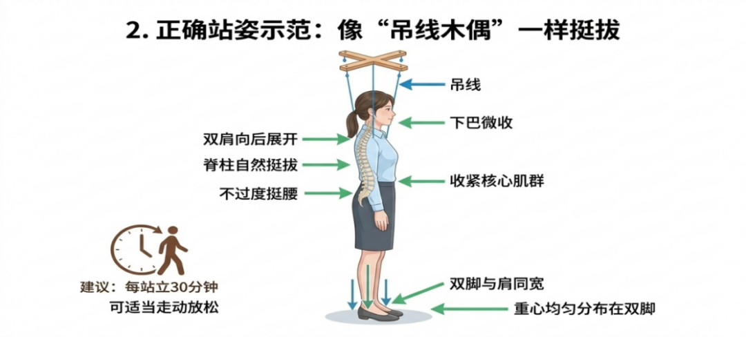 2. 正确站姿:像“吊线木偶”一样挺拔