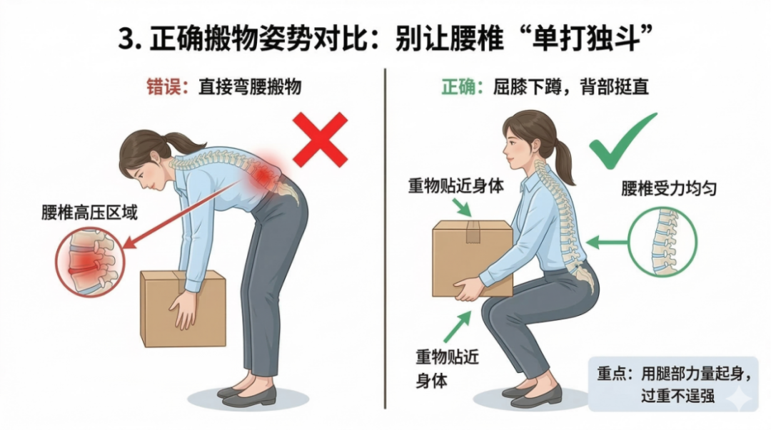 3. 正确搬物姿势:别让腰椎“单打独斗”