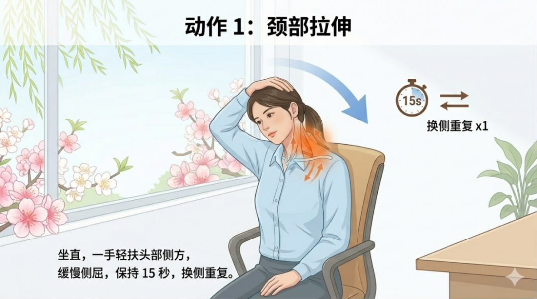 1.颈部拉伸:坐直,右手轻扶头部左侧,缓慢将头向右肩倾斜,保持15秒后换侧,重复2-3组,缓解颈部僵硬。