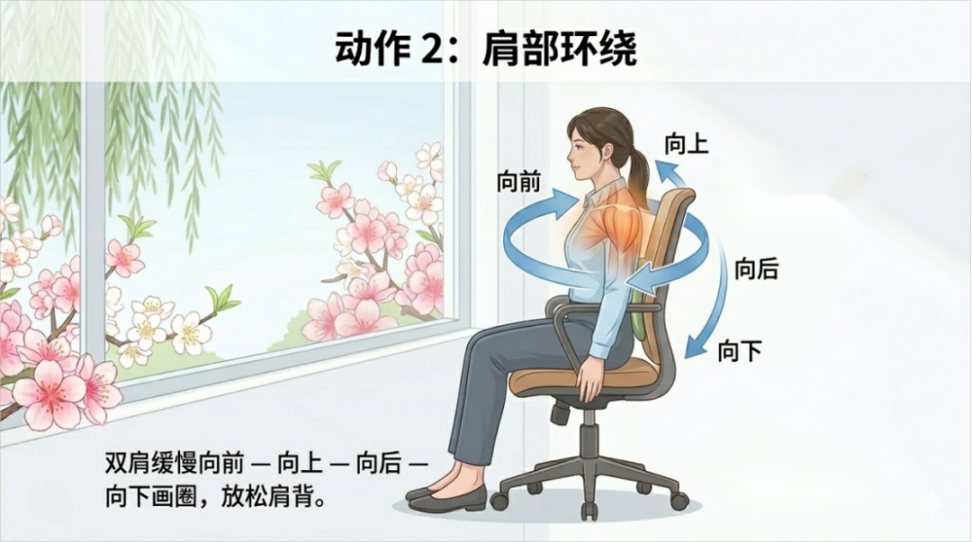 2.肩部环绕:双肩缓慢向前、向上、向后、向下做环绕运动,每次10圈,放松肩背肌群。