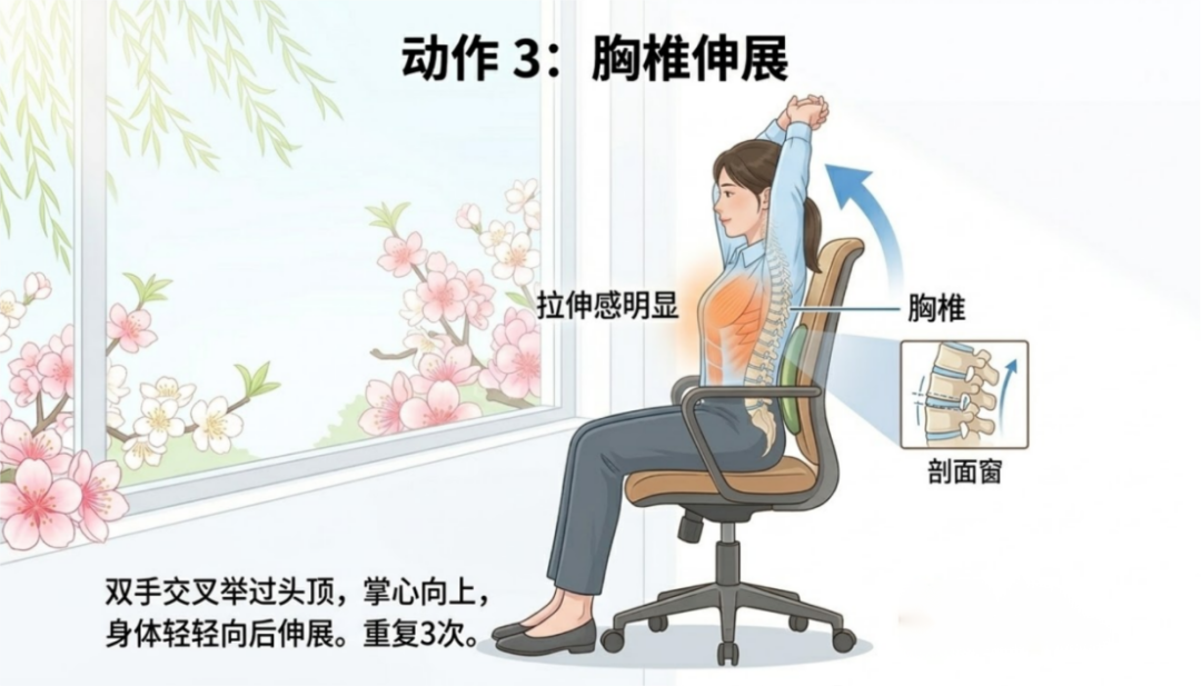 3.胸椎伸展:双手十指交叉,举过头顶,掌心向上,身体缓慢向后伸展,感受胸椎的拉伸,保持10秒,重复3次。