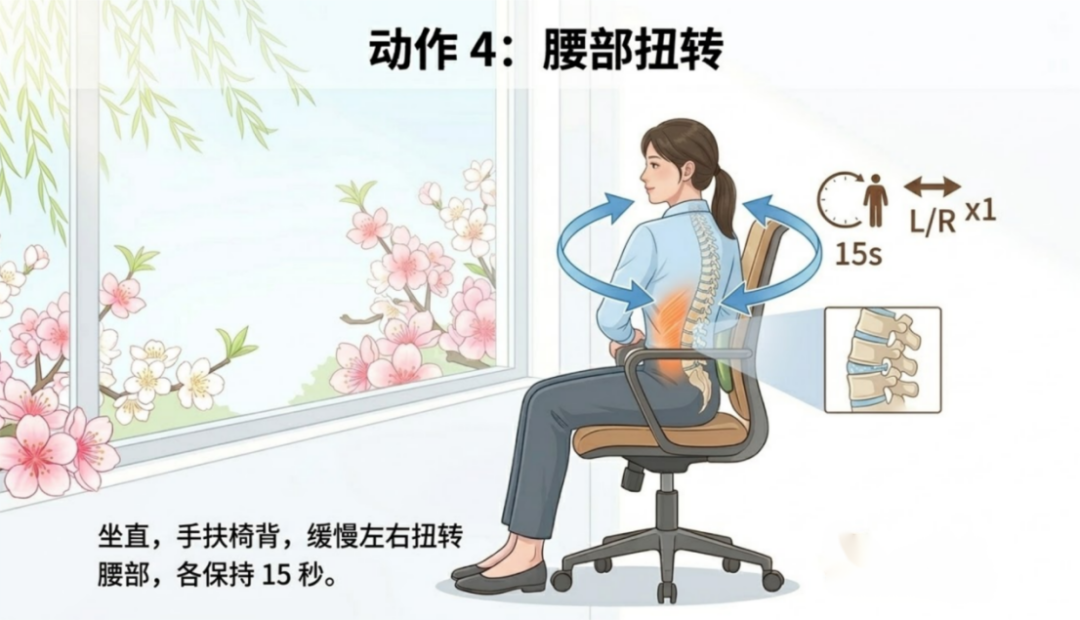 4.腰部扭转:坐直,双手扶住椅背,缓慢向左侧扭转腰部,保持15秒后换侧,改善腰部血液循环。