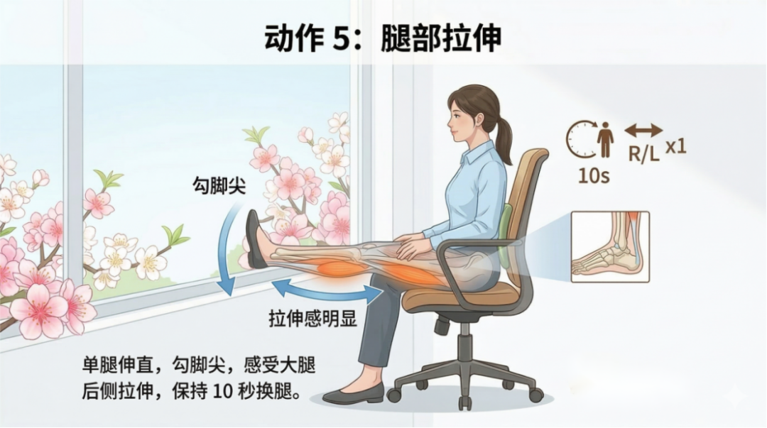 5. 腿部放松:双脚踩地,缓慢抬起一条腿,伸直后勾脚尖,感受大腿后侧拉伸,保持10秒后换腿,缓解下肢僵硬。
