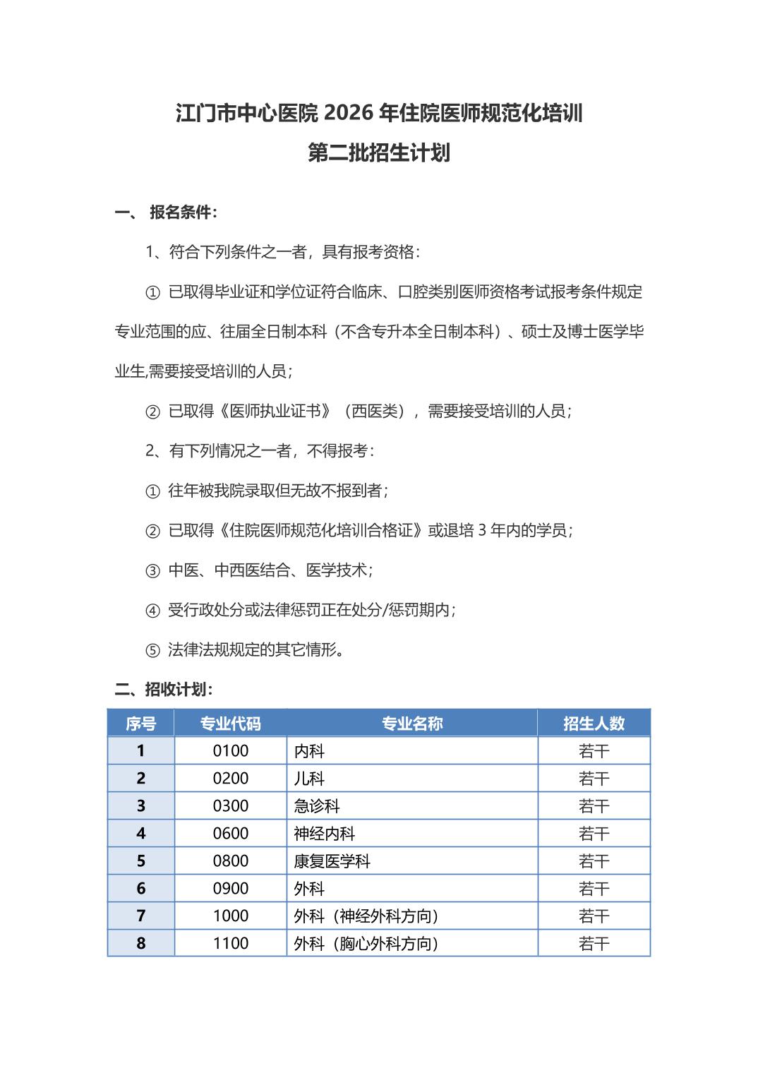 江门市中心医院2026年住院医师规范化培训第二批招生计划