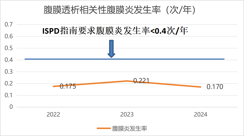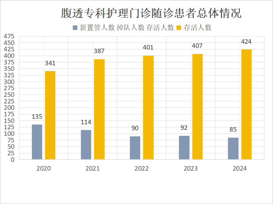目前,现存腹膜透析患者共计424例,同比增长4.17%,患者总数呈现稳步增长态势。在工作量方面,2024年护理团队全年累计接待腹透门诊患者3727人次,同比增长12.83%;2024年,腹膜中心腹膜炎的发生率为0.17次/年,腹膜透析患者发生腹膜炎的风险显著低于国际腹膜透析指南所规定的0.4次/年标准。