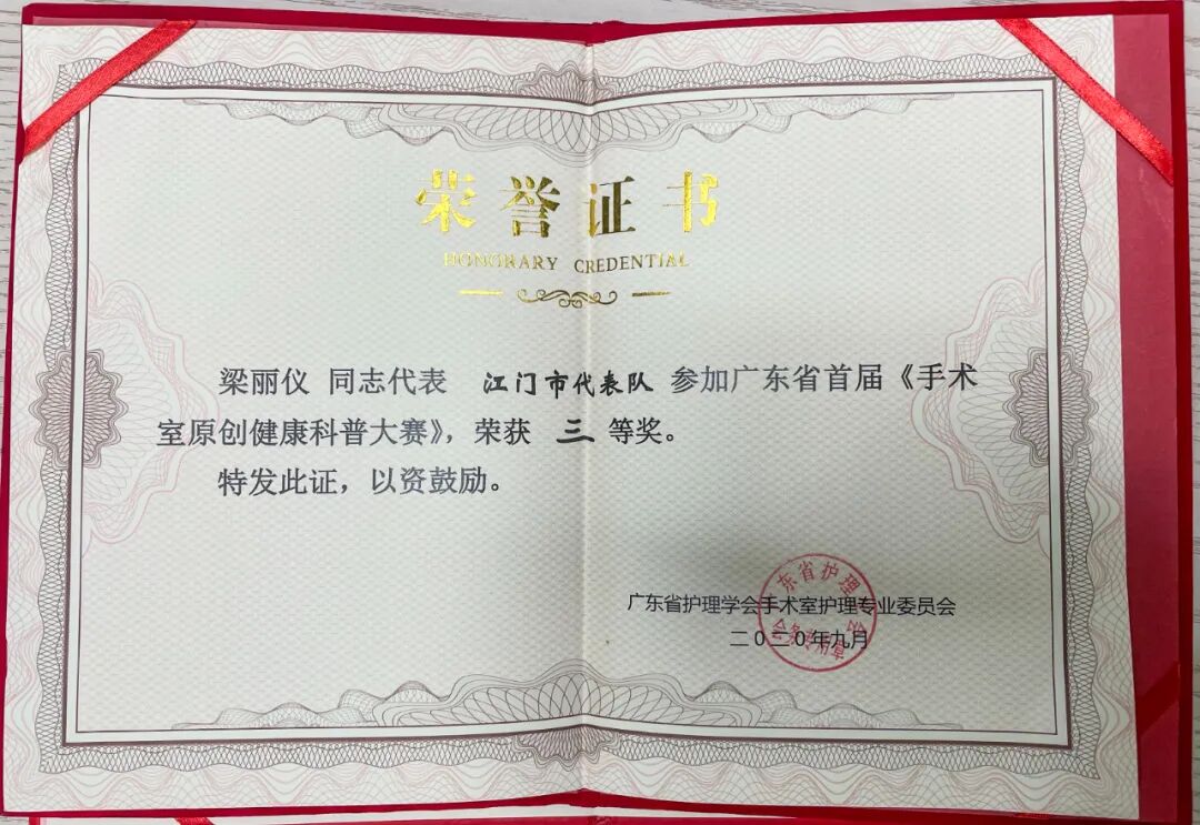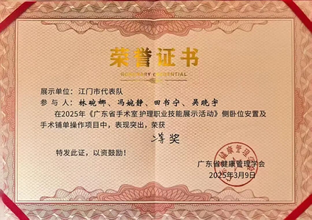 手术室护理团队深耕专科发展,下设普外小儿、妇科、胃肠肝胆、心胸外科、神经外科、骨科、机器人手术等9个亚专科护理小组,实现与外科亚专科的精准对接与深度融合,年均手术量达6万台(含住院和门诊手术)。作为江门市手术护理专科委员会主委单位,年均省、市科级研立项达3~4项;成立五邑地区首个手术麻醉护理培训基地,为五邑地区及邻近医疗单位培养手术、麻醉护理专科人才;麻醉手术中心于2018年被评为市级青年文明岗,于2020年被评为市级巾帼文明岗,并成为粤港澳手术质量安全联盟核心单位。