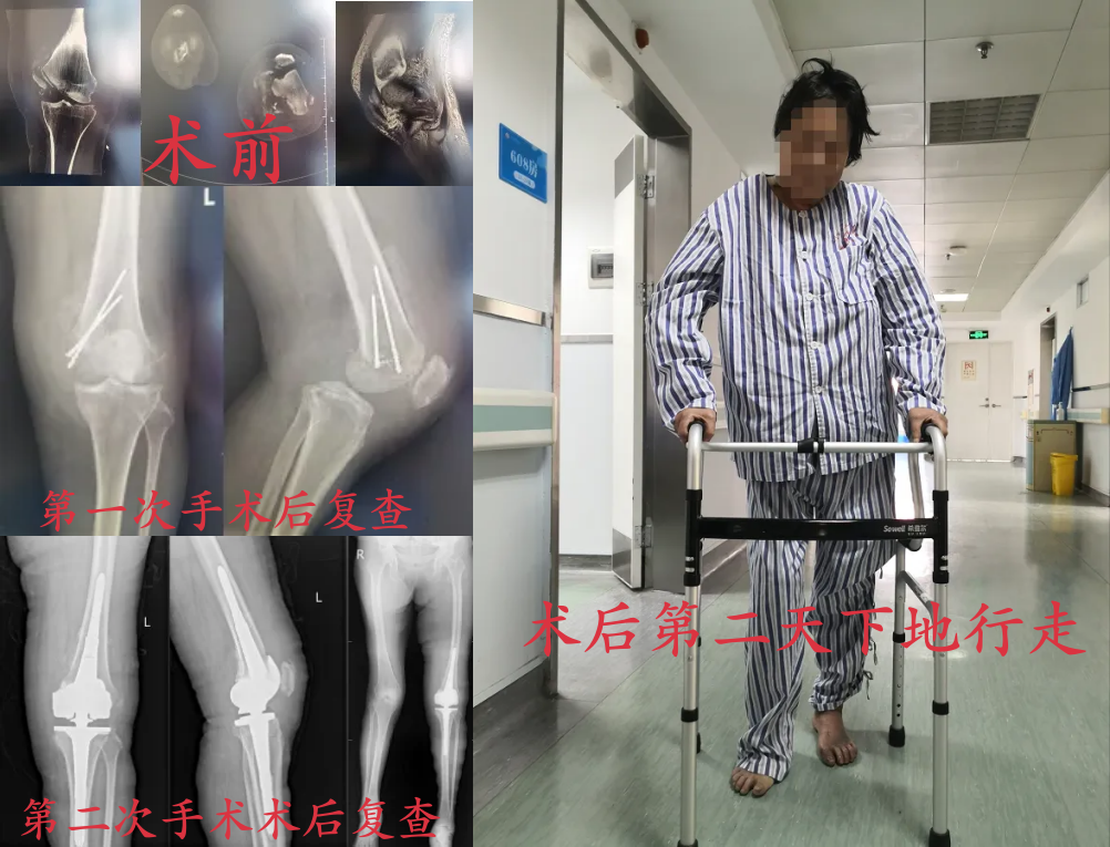 病情平稳后,团队分两阶段手术:先清创植入抗生素骨水泥控炎,再采用国内少用的“新式旋转铰链型膝关节系统”适配骨缺损。术后第二天,冯婆便能站立迈步,经康复训练后恢复日常行走,每次复诊都感叹:“江门医生技术真高超!是你们给了我重新走路的机会。”