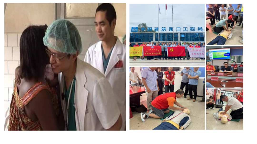 刘湘杰于2014年完成援非工作后(左一),发挥专业优势,率先深入企业开展心肺复苏培训,赋能社会急救能力,共筑江门生命安全基石。(右二)。