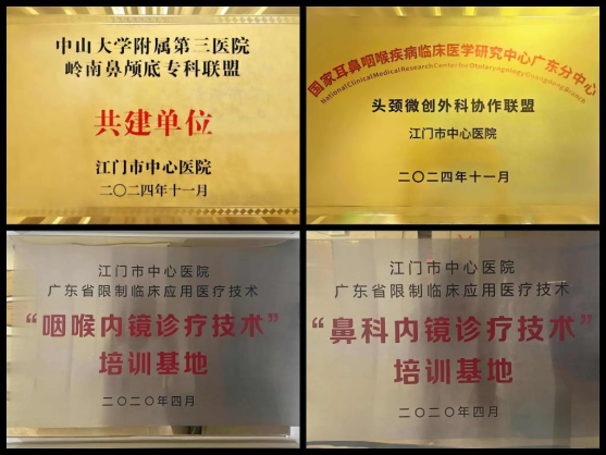 科室现为国家耳鼻咽喉疾病临床医学研究中心广东分中心头颈微创外科协作联盟核心成员、广东省限制临床应用医疗技术(咽喉内镜/鼻科内镜诊疗技术)培训基地、中山大学附属第三医院岭南鼻颅底专科联盟共建单位,并担任广东省医学会耳鼻咽喉科分会常委单位。此外,科室也是广东省新生儿听力障碍诊治机构、江门市新生儿听力障碍诊治机构。作为本地区规模与技术实力领先的耳鼻咽喉与头颈专科,服务与影响力深度覆盖全域,并辐射至港澳地区。