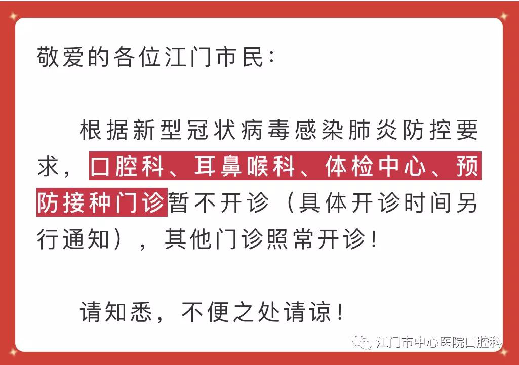 为了避免新型冠状病毒疫情进一步蔓延,全国多地口腔门诊相继发布了停诊或者延迟开诊的通知,纷纷倡导非口腔急诊(如牙齿矫正、镶牙、普通牙拔除(包括智齿)等)不需来院就诊。那么为什么不主张去看牙?在这非常时期,我们应该如何预防口腔疾病?在哪种情况下必须要去门诊就诊?诊疗时应注意哪些问题?就以上问题,就以上问题,江门市中心医院的医生们给出指导建议。